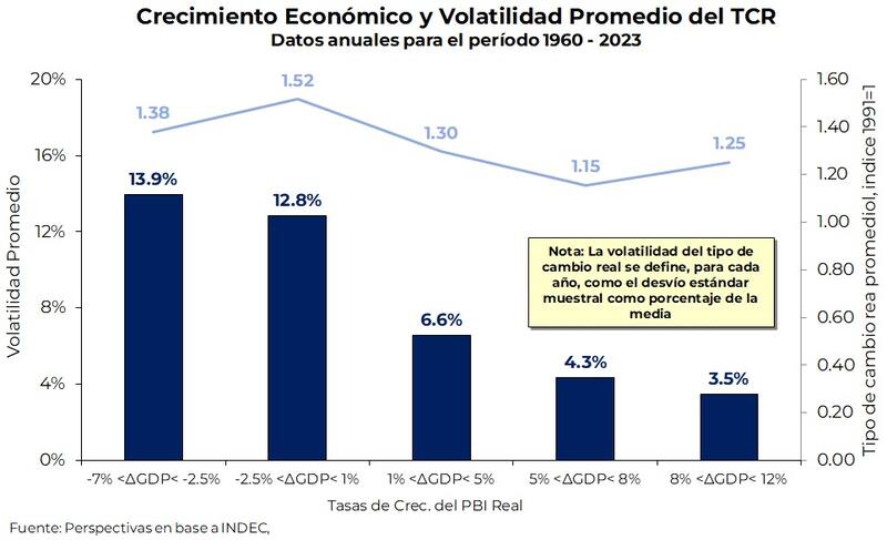 Tomando datos entre 1960 y 2023, y dividiéndolos en grupos de igual cantidad de observaciones, resulta que las mayores tasas de crecimiento económico están asociadas con la volatilidad cambiaria más baja. En cambio, las contracciones severas del PBI coinciden con una volatilidad más alta (hasta cuatro veces mayor a la observada en los períodos de mayor crecimiento). El nivel del TCR promedio muestra, por su parte, una relación más débil con el crecimiento, variando ligeramente en los diferentes rangos de crecimiento.