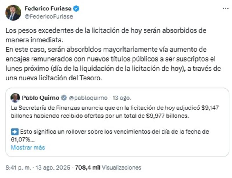 "Los pesos excedentes de la licitación de hoy serán absorbidos de manera inmediata -adelantó en la red social X-. En este caso, serán absorbidos mayoritariamente vía aumento de encajes remunerados con nuevos títulos públicos a ser suscriptos el lunes próximo (día de la liquidación de la licitación de hoy), a través de una nueva licitación del Tesoro", sorprendió.