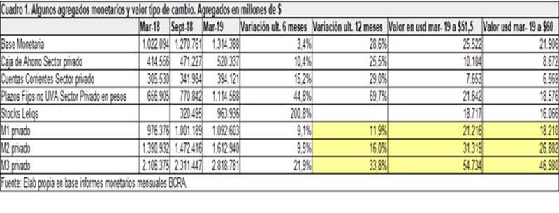 Finalmente, y más alla de algunas políticas inconsistentes con un sendero de desinflación como la indexación de las tarifas (dolarizadas) y de los ingresos y salarios (en algunas negociaciones salariales recientes se estableció incluso una indexación salarial trimestral), la probabilidad de una hiperinflación, durante los próximos meses, depende del tipo de cambio. En el cuadro 1, se presentan algunos agregados monetarios y su valor en dólares para diferentes tipos de cambio.
