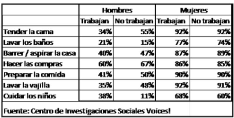 Como puede verse en la tabla de arriba, las mujeres que trabajan y no trabajan tienen mínimas diferencias en términos de las tareas hogareñas que realizan. Además, en todos los casos las mujeres que trabajan realizan más las tareas del hogar que los hombres. Es interesante ver que la tarea que se reparte de manera más equilibrada es la realización de compras. También que, en algunos rubros como compras o lavar vajilla, los varones que no trabajan colaboran más, mientras que en otros como el cuidado de niños, colaboran aún menos que los padres que sí trabajan.