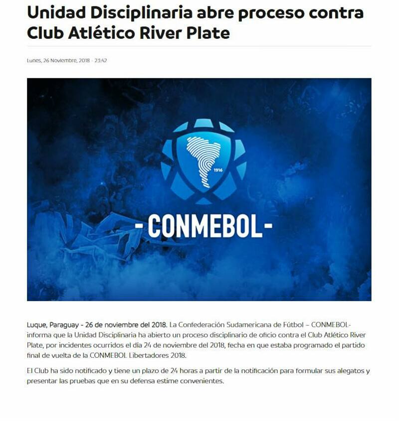 La Conmebol informó que la Unidad Disciplinaria de la entidad abrió un proceso contra River, a raíz de los incidentes ocurridos en el Estadio "Monumental". El club de Núñez tendrá tiene 24 horas para hacer su descargo.