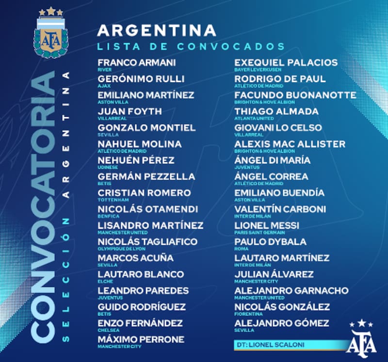 Al listado lo componen, entre otros jugadores, Lionel Messi, Ángel di María, Emiliano "Dibu" Martínez, Rodrigo de Paul y Enzo Fernández.
