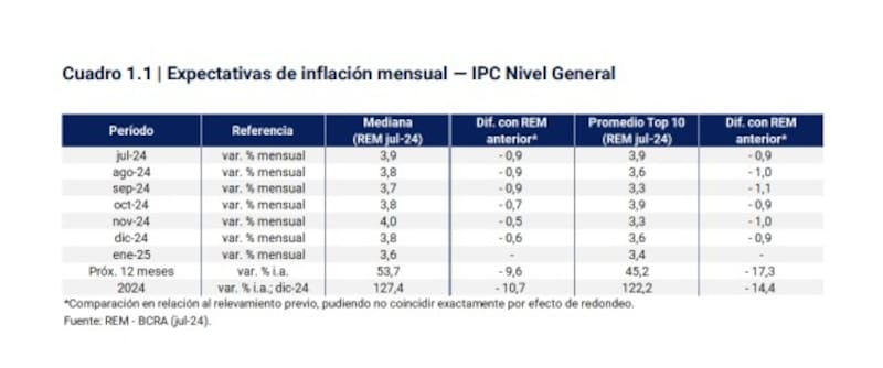 Para agosto, en tanto, proyectaron una suba de precios mensualde 3,8% y para el año de 127,4% interanual (-0,9 p.p. y -10,7 p.p. en relación con la encuesta previa, respectivamente).