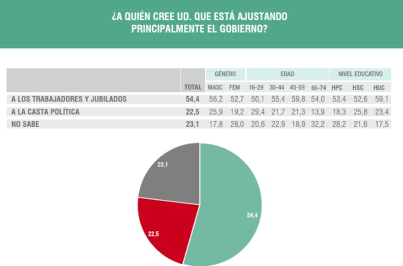 Uno de los resultados más llamativos se dio ante la pregunta: "¿A quién cree usted que está ajustando principalmente el gobierno?" El 54,4% respondió que a los trabajadores y jubilados, mientras que un lejano 22,5% sostuvo que el ajuste se dirige a la casta política, contradiciendo así una de las principales promesas de campaña de Milei.