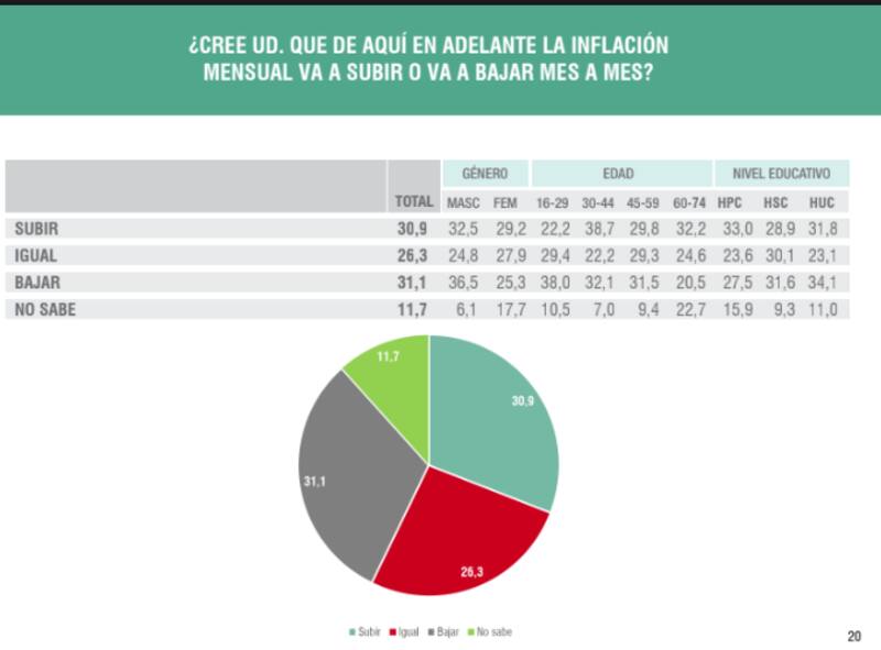 Del sondeo se deduce que la gente sigue confiando en la perspectiva de baja inflacionaria que empuja el Gobierno. Esto se ve reflejado en que un 31,1% dijo que en los próximos meses la inflación va a bajar, contra un 30,9% que dijo que va a subir, mientras que un 26,3% dijo que se iba a mantener igual.
