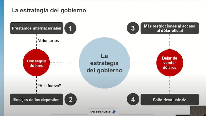 Frente a estas metas difíciles de alcanzar, Sandleris planteó luego cuales son las posibles estrategias que podría tomar el gobierno para tratar de acercarse a ese número, que redujo a cuatro opciones, aclarando que el gobierno ya hizo "un poquito de cada una": buscar préstamos internacionales, utilizar los encajes de los depósitos en dólares, establecer más restricciones al acceso al dólar oficial y un salto devaluatorio.