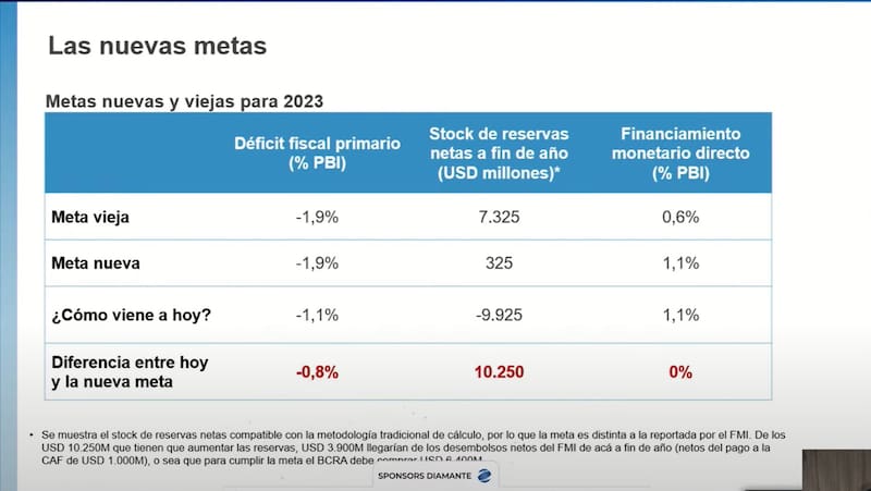También se refirió a las metas de reservas que establece el acuerdo. "La meta anterior planteaba que Argentina tenía que llegar a fin de año con 7.300 millones de dólares, eso se redujo a 300, una drástica reducción. ¿Cuánto tiene Argentina hoy de reservas internacionales en el Banco Central? Menos 9.900 (millones). Es decir que de hoy a fin de año el banco central debería comprar 10.250 millones de dólares para cumplir con estas metas de reservas".