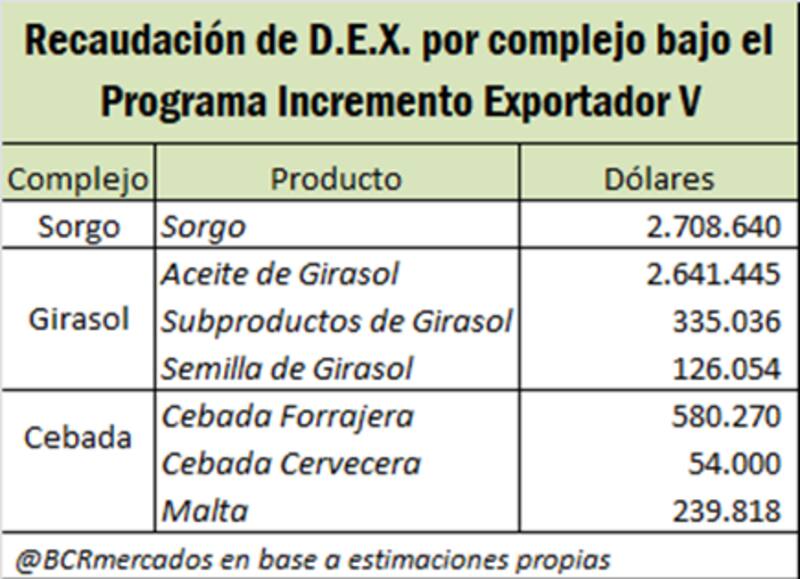 En base a estimaciones de la BCR, considerando únicamente las DJVE de productos a embarcar previo al 31 de diciembre, entre el 11 y 20 de octubre, el complejo sorgo generó la recaudación en DEX de u$s 2,7 millones, el girasol u$s 3,1 millones mientras que la cebada representó u$s 0,8 millones.