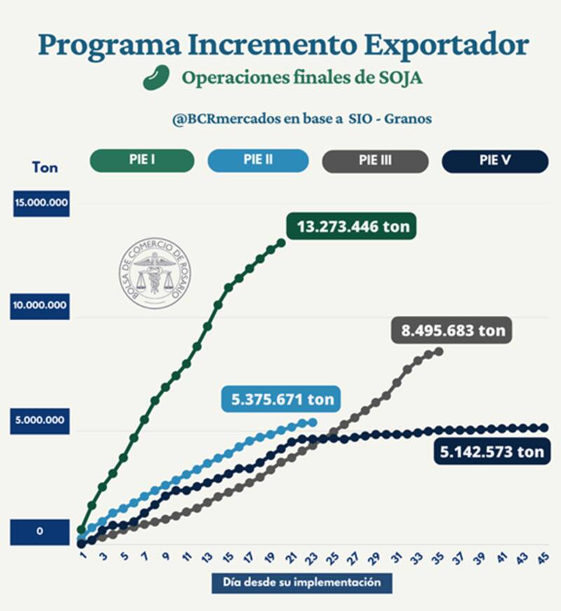 Según las estimaciones de la entidad rosarina- considerando únicamente la soja de origen nacional, el programa aportó -entre el 5 de septiembre y 24 de octubre- 218 millones de dólares en carácter de DEX, principalmente por poroto de soja.