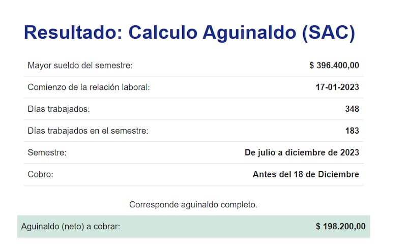 Por ejemplo, si tomás el sueldo básico de un empleado de comercio, que es de $ 396.400, y el mismo comenzó a trabajar el 17 de enero del 2023, le corresponde cobrar el aguinaldo completo. En este caso, sería de $ 198.200.