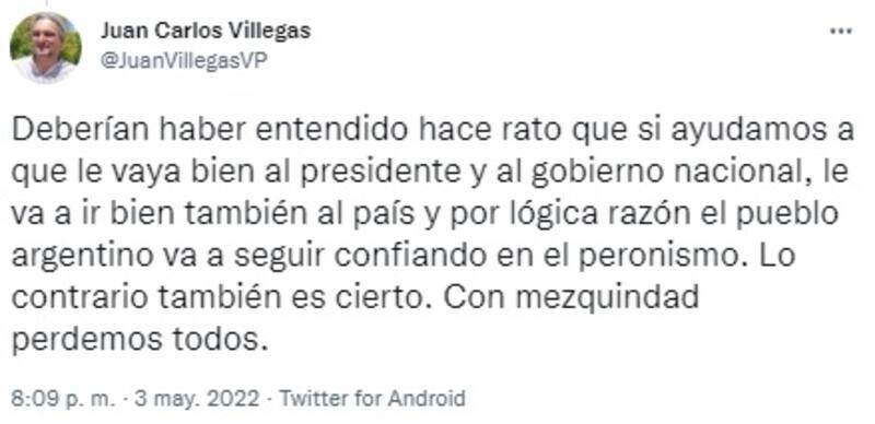 "Deberían haber entendido hace rato que si ayudamos a que le vaya bien al presidente y al gobierno nacional, le va a ir bien también al país y por lógica razón el pueblo argentino va a seguir confiando en el peronismo. Lo contrario también es cierto. Con mezquindad perdemos todos", sentenció.