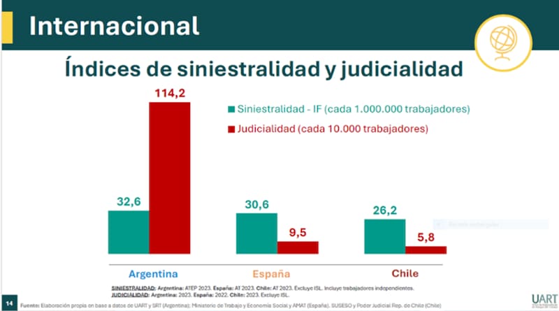 A modo de referencia, para 2023 Argentina tuvo 114,2 juicios por cada 10.000 trabajadores cubiertos, mientras que países como España y Chile registran apenas 9,5 y 5,8.