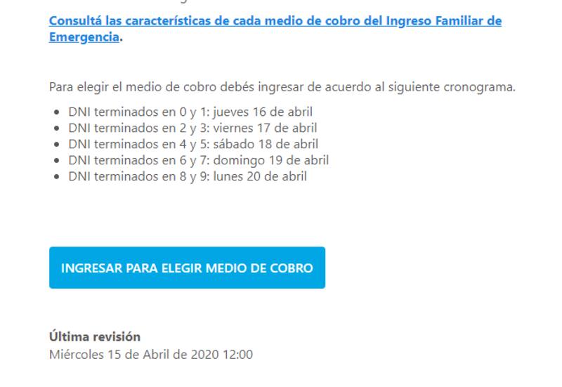 Los beneficiarios del Ingreso Familiar de Emergencia (IFE) que no hayan elegido aún su medio de pago para cobrar los $ 10.000, podrán ingresar a partir de esta medianoche en la página web de la ANSES (www.anses.gob.ar) para seleccionarlo.