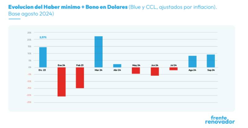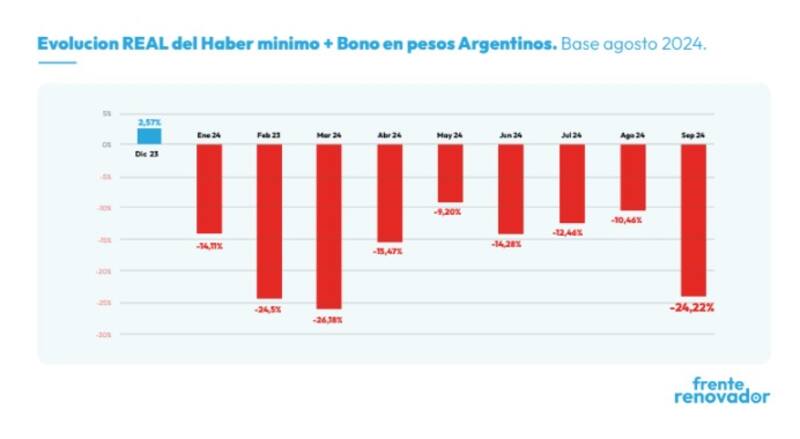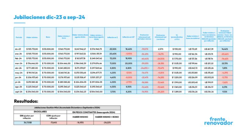 Según el informe, los haberes mínimos registraron una "caída real del -24,22% respecto a septiembre de 2023 y del -19,21% si tomamos desde diciembre". Las jubilaciones por encima de la mínima, que no reciben bonos compensatorios, también experimentaron una pérdida significativa en términos reales, con una caída interanual del -16,95% y una disminución del -5,40% desde diciembre de 2023. Esta situación, según el Frente Renovador, pone en evidencia el impacto negativo de las políticas actuales sobre los jubilados.