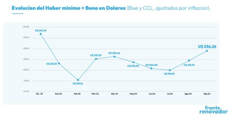 El análisis también incluye una comparación en términos de dólares, tomando como referencia el dólar paralelo, debido al control del dólar oficial. Según el Frente Renovador, "si a la jubilación mínima (más el bono) la medimos en dólares y lo ajustamos por la inflación en dólares, que fue del 68% desde diciembre a la fecha, pasamos de una jubilación en U$267,39 en diciembre 2023 a U$236,26". Esto representa una "caída en términos reales del -11,54%", un dato que, según el espacio liderado por Massa, refleja la erosión del poder adquisitivo de los jubilados en un contexto de alta inflación y devaluación de la moneda.