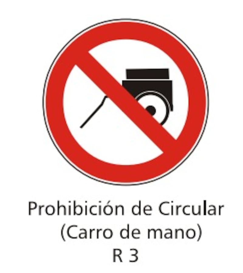 El cartel blanco muestra un círculo rojo con una banda el mismo color en diagonal. Tras la banda, se muestra un cierto tipo de carreta. Según el Gobierno nacional, su significado es la "prohibición de circular con carros de mano".