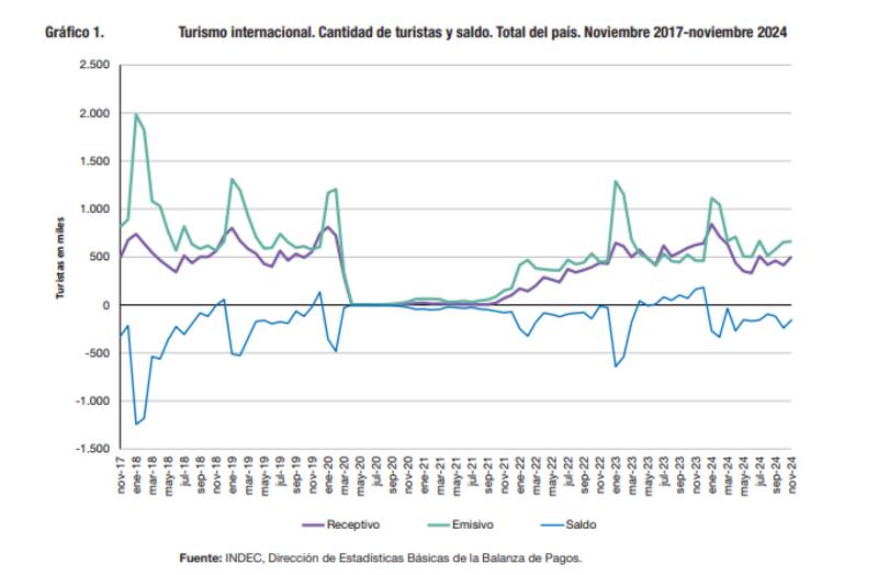 La caída de los turistas extranjeros marcó una baja del -29,2% en visitantes y del 28% en viajes. Del otro lado, los argentinos que viajaron al exterior en noviembre crecieron 64%, en línea con los viajes.