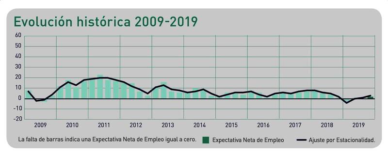 La encuesta, realizada entre más de 800 empleadores, mide la expectativa neta de empleo (ENE), que se obtiene al tomar el porcentaje de empleadores que espera aumentar sus dotaciones y restarle el porcentaje que espera una disminución durante el próximo trimestre.