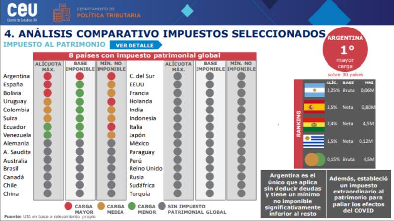 A nivel de la regional, un informe del Centro de Estudios de la Unión Industrial Argentina (UIA) de diciembre de 2021, reveló que la Argentina ocupa el podio en cuanto a la mayor carga, por encima de España y Bolivia. "Se aplica [sin la posibilidad] de deducir deudas y tiene un mínimo no imponible, significativamente inferior al resto", destacaron.
