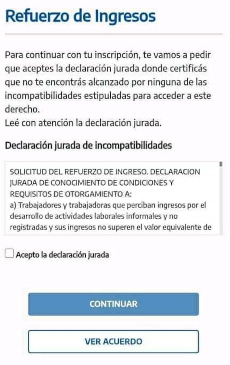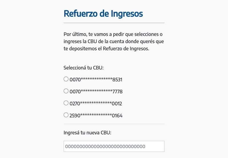 "Este jueves 28 de abril comienza la segunda etapa de la inscripción al Refuerzo de Ingresos, donde vas a poder completar la solicitud firmando la declaración jurada y vas a cargar tu cuenta bancaria (CBU)", señaló el organismo conducido por Fernanda Raverta vía Twitter.