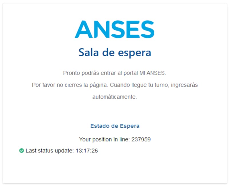 "ANSES: Sala de espera. Pronto podrás entrar al portal Mi ANSES. Por favor no cierres la página. Cuando llegue tu turno, ingresarás automáticamente", advierte una leyenda.