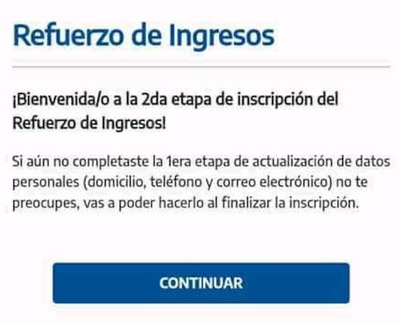 2) Seleccionar la opción "Refuerzo de Ingresos". Al instante te aparecerá la siguiente leyenda "¡Bienvenida/o a la 2da etapa de inscripción del Refuerzo de Ingresos!"