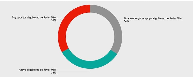 Dentro de los oficialistas, un amplio grupo del 79% afirma que hay que apoyar hasta que termine el mandato. Dentro del 33% opositor el 87% afirma no haberle dado nunca el apoyo a Milei y un 9% dice que el Gobierno "lo defraudó".