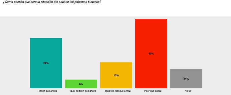 Además, se disparó con fuerza el pesimismo: el 40% cree que el país estará peor dentro de seis meses (subiendo 10 puntos en los últimos 4 meses). Como contrapartida, el optimismo se derrumbó de 39% a 29%.