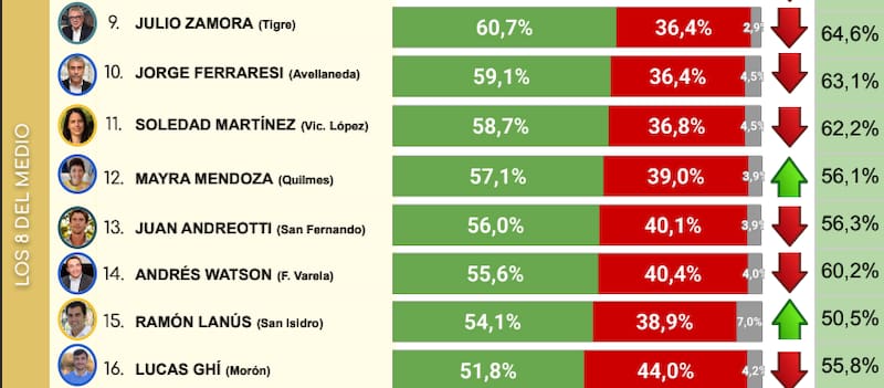 Por debajo, quedaron Avellaneda, con el 59,8% negativo (33,9% positivo ahora, versus 40,3% de diciembre); Malvinas Argentinas, 59% (36% vs. 42,9%); Moreno, 58% (36,9% vs. 44,9%); Lanús, 58% (37,5% vs. 43%); La Matanza, 56,6% (37,5% vs. 44%); Berazategui, 55,9% (37,7% vs. 43,9%); Lomas de Zamora, 56,7% (38,2% vs .45,4%).