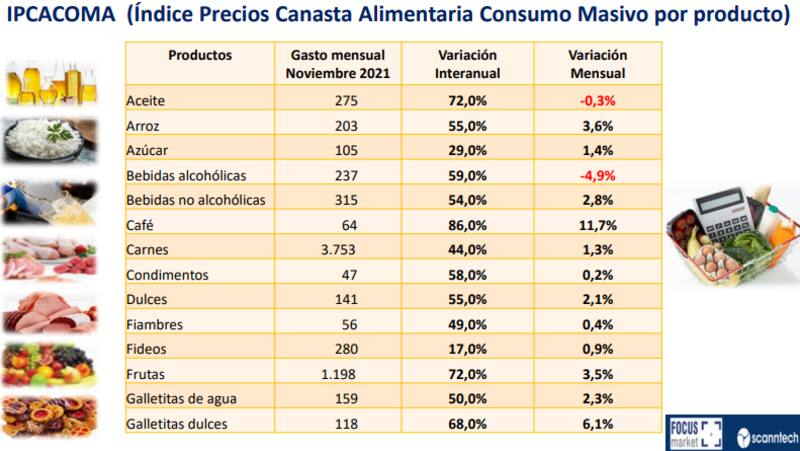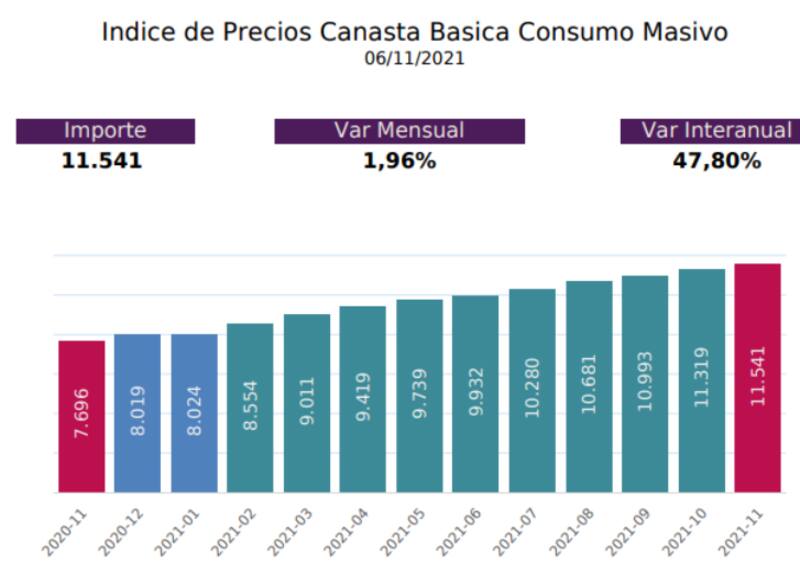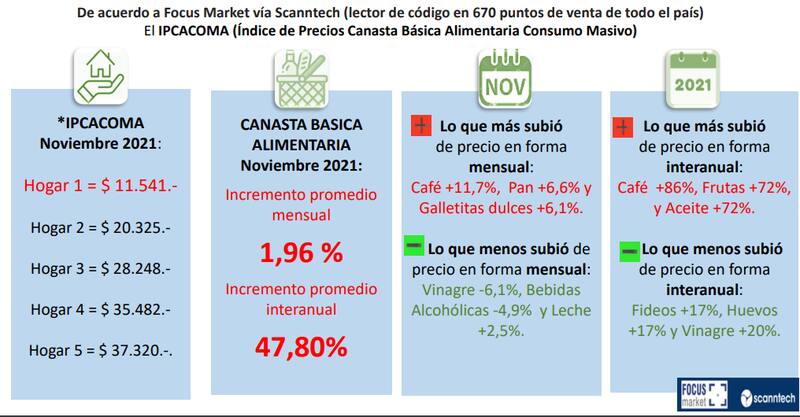 LaCanasta Básica Alimentaria (CBA) de noviembre registró menor variación que la del mes de octubre, sin embargo continúa con un piso de 2%. Así lo indicó el último informe de la consultora Focus Market, mediante el IPCACOMA (Índice de Precios Canasta Básica Alimentaria Consumo Masivo).