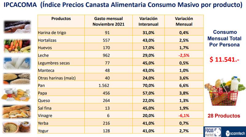 "Durante el mes de noviembre la búsqueda de congelar precios en la Canasta Básica Alimentaria parecería dar resultado con un incremento del 2%" de la categoría alimentos y bebidas en términos globales, que no incluye solo los alimentos básicos, especificó el director de Focus Market, Damián Di Pace.