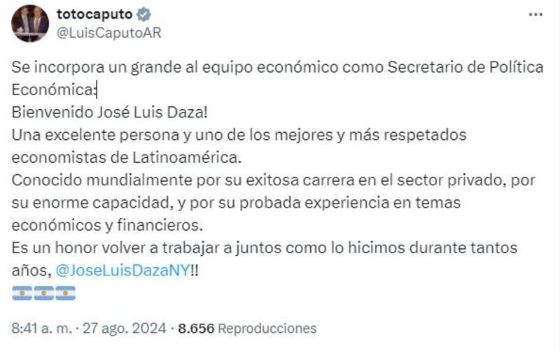 Luego del anuncio oficial, Daza también utilizó las redes para agradecerle a Caputo por sus palabras: "Es difícil expresar el honor que significa para mí ser parte del equipo que lideras y del Gobierno del presidente Javier Milei", escribió.