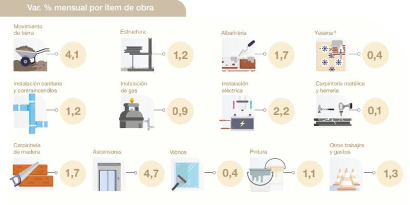 El relevamiento refleja subas de 6,4% en artefactos de iluminación y portero eléctrico; 5,9% en cables y conductores de media y baja tensión; 4,9% en aparatos de control eléctrico; 4,7% en ascensores; 4,1% en electrobombas; 3,4% en productos de cobre, plomo y estaño; 3,2% en mesadas de granito y 2,4% en pisos de alfombra.