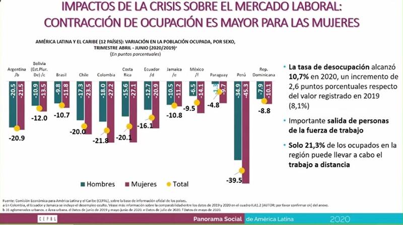Esto se da en un escenario de una "importante salida de personas del mercado de trabajo", apunta Cepal y un contexto en el que "sólo 21,3% de los ocupados en la región puede llevar a cabo el trabajo a distancia" y 30% de las mujeres pobres de la región no pueden participar del mercado laboral por razones familiares. Sencillamente, porque deben quedar al cuidado de niños, niñas o mayores.