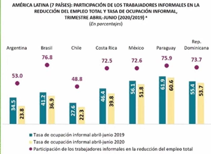 El país se ubica en un pelotón que integran países como Chile (20%), Colombia (21,8%) y Costa Rica (20,1%), y sólo es superado por Colombia y Perú, que con una contracción de 39,5% en la población ocupada, lidera el ranking regional.