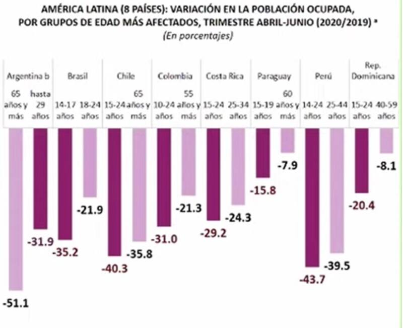 Y allí aparece otro dato preocupante. En casi todos los países la mayor caída del empleo se dio entre los más jóvenes, pero en Argentina el 51,1% de la ocupación se perdió en personas de 65 años o más, quienes difícilmente pueden volver a insertarse en el mercado laboral. Y en segundo término, personas hasta 29 años.