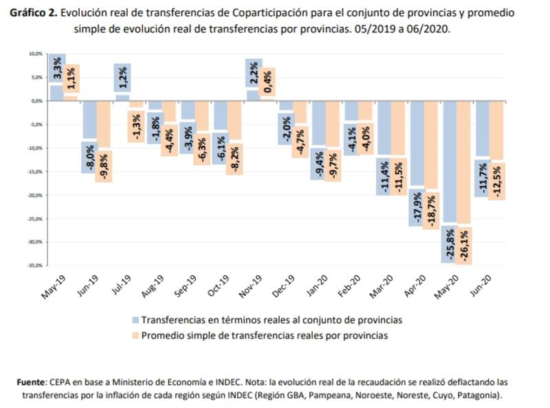 El volumen de transferencias de coparticipación federal de impuestos al conjunto de las provincias cayó un 11,7% real en junio respecto al mismo mes del año pasado, estimó el Centro de Economía Política Argentina (CEPA) en su informe mensual.