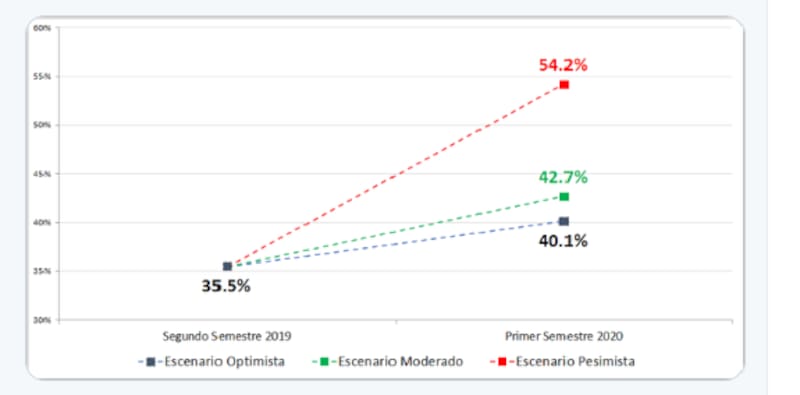 En el escenario moderado, la dinámica del mercado de trabajo sería similar a la que se atravesó en la recesión del 2009, año en el que los ingresos totales familiares crecieron, en promedio, alrededor de 4 puntos porcentuales menos que la inflación. De esta manera, la incidencia de la pobreza en el primer semestre sería de 42,7%.