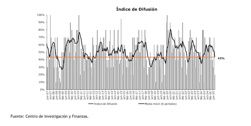 El deterioro del índice no fue solo cuantitativo. El Índice de Difusión, que mide cuántas de las series componentes muestran variaciones positivas significativas, se ubicó en apenas 20%. Es decir, apenas dos de los diez indicadores mejoraron: el precio de la soja y la recaudación de IVA.