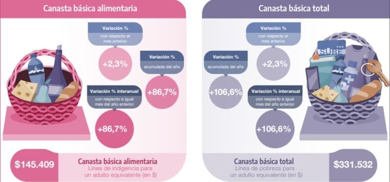 Por su parte, el Instituto Nacional de Estadísticas y Censo (INDEC) determinó el valor de la Canasta Básica Alimentaria (CBA) y de la Canasta Básica Total (CBT), que ayuda a determinar las situaciones sociales de los hogares y de las personas.