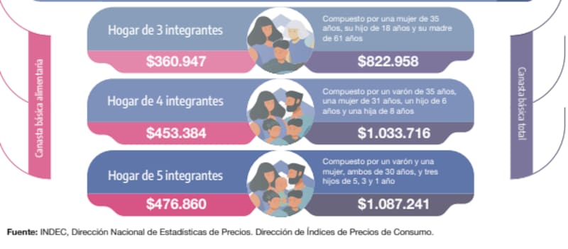 Por último, un hogar compuesto por cinco integrantes (un varón y una mujer, ambos de 30 años, y tres hijos de 5, 3 y 1 año) debió tener ingresos por un total de $ 1.087.241 para no caer en la pobreza, y $ 476.860 para no pasar a engrosar el listado de indigentes.