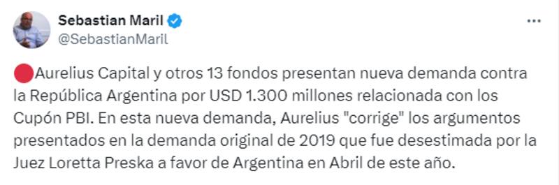 Al respecto, el especialista Sebastián Maril precisó que "en esta nueva demanda, Aurelius ‘corrige' los argumentos presentados en la demanda original de 2019 que fue desestimada por la juez Loretta Preska a favor de Argentina en abril de este año".