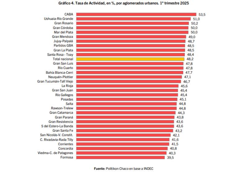 En relación con la tasa de actividad, solo cinco aglomerados urbanos medidos por la EPH-INDEC presentaron tasas iguales o superiores al 50%: lidera CABA (53,5%) seguida por Ushuaia-Río Grande (51,0%), Gran Rosario (50,2%), Gran Córdoba (50,0%) y Mar del Plata (50,0%).