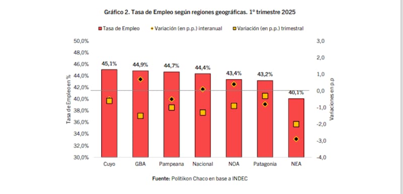 De una manera global, el sector que peor está según la investigación es el NEA (Noreste Argentino), que incluye provincias como Formosa, Chaco, Corrientes y Misiones. Esto se evidencia por tres indicadores clave: tasa de actividad baja, tasa de empleo baja y desocupación en alza.