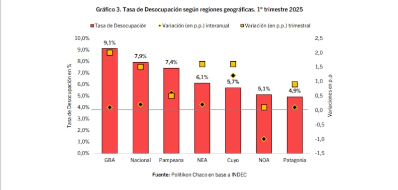 Entre las regiones geográficas del país, la mayor tasa de desocupación estuvo en el GBA con 9,1%, única en posicionarse por encima del nivel total nacional; en el otro extremo, la Patagonia presenta la tasa más baja del país con 4,9%.