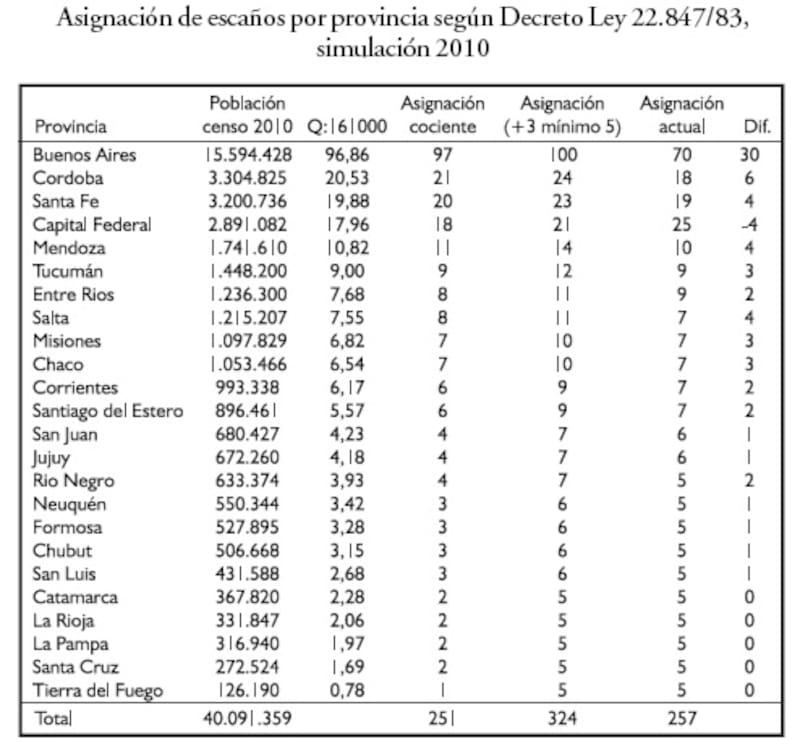 Pero el otro inconveniente es que nunca se actualizó la cantidad de diputados en relación a la población, a pesar de que se tenía que hacer tras cada censo. Si se hubiera realizado la actualización, como indica la norma, hoy la Cámara de Diputados debería tener 324 miembros. De ellos, 100 serían bonaerenses, en vez de los 70 actuales. También habría seis cordobeses más, cuatro santafesinos y cuatro mendocinos extra. Esto se puede ver en el siguiente cuadro elaborado por Diego Reynoso, en su trabajo de investigación “El reparto de la representación. Antecedentes y distorsiones de la asignación de diputados a las provincias .