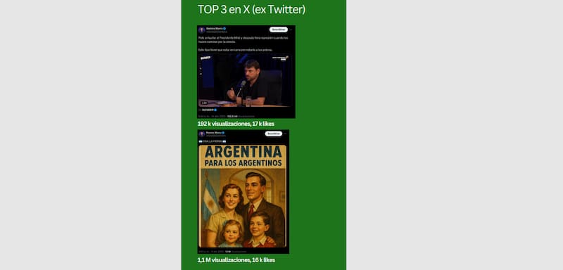En X (ex Twitter), sus tres mejores contenidos por "me gusta" no están relacionados con la campaña: Una foto anunciando la salida del cepo; un enfrentamiento con Juan Grabois y un afiche sobre la argentinidad.
