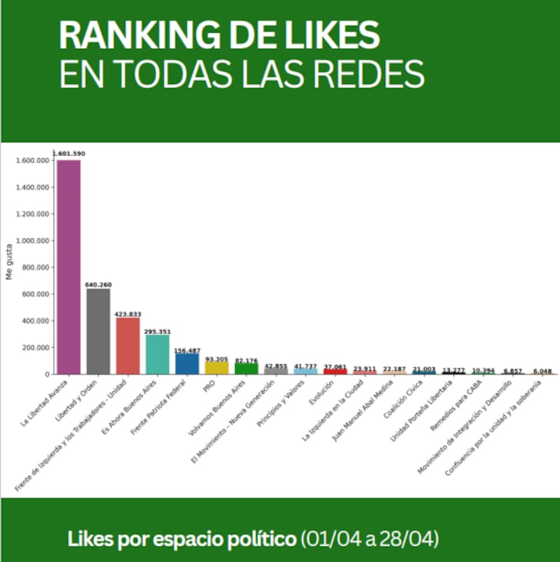 "Sumando los "me gusta" que obtuvieron los 33 candidatos analizados entre el 1 y el 28 de abril en X (ex Twitter), Instagram, Facebook y TikTok, La Libertad Avanza surge como la fuerza con más potencia en las redes, con algo más de un millón y medio de likes acumulados en el mes", aseguraron desde la Consultora.