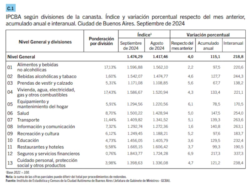 Con el 4% de septiembre, la trayectoria interanual (ia) de la inflación porteña se ubicó en 218,8%, lo que representa una baja de 24,3 puntos porcentuales (pp) contra el mes anterior, según detalló el Instituto de Estadística y Censos de la Ciudad.