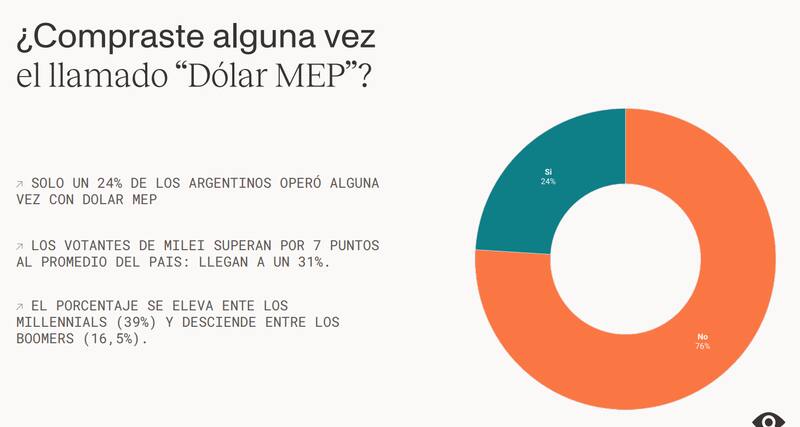 Respecto a las criptomonedas, el 57% de los encuestados manifestó rechazo hacia esta alternativa, cifra que ascendió al 70% entre los mayores de 55 años. Además, solo el 24% de los consultados operó alguna vez con Dólar MEP.